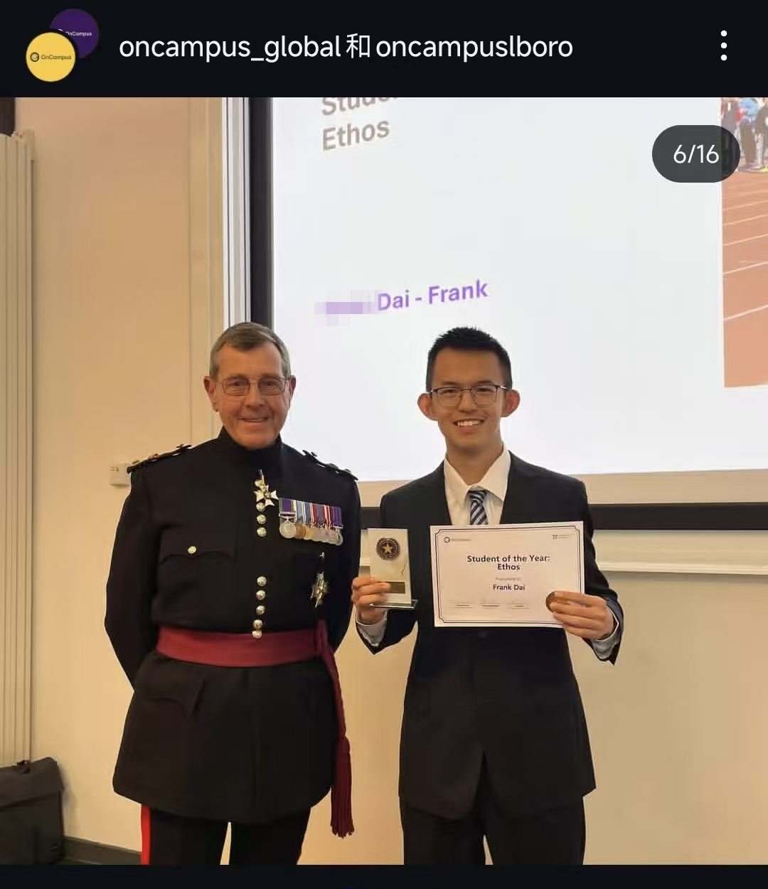 功夫不负有心人,2025年9月,代同学凭借优异的预科成绩、出色的学术表现以及积极的校园参与度,成功获评拉夫堡大学本科预科 “优秀明星学员”。在表彰仪式上,学校校长亲自为其颁发奖状与推荐信,并高度肯定了他在学习过程中展现出的毅力与潜力。这份荣誉不仅是对代同学个人努力的最高认可,更是对“外服留学”专业规划能力的有力证明。