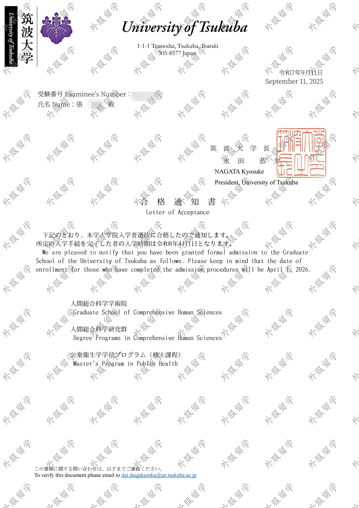 日本筑波大学公共卫生学专业修士(硕士学位)offer