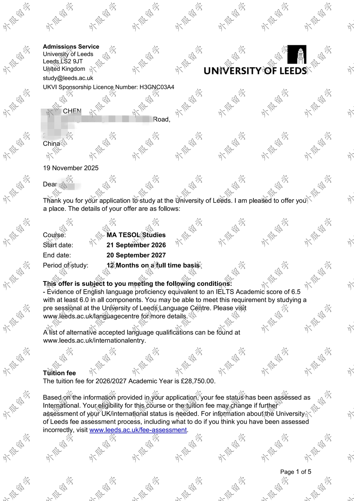 英国利兹大学TESOL专业硕士offer
