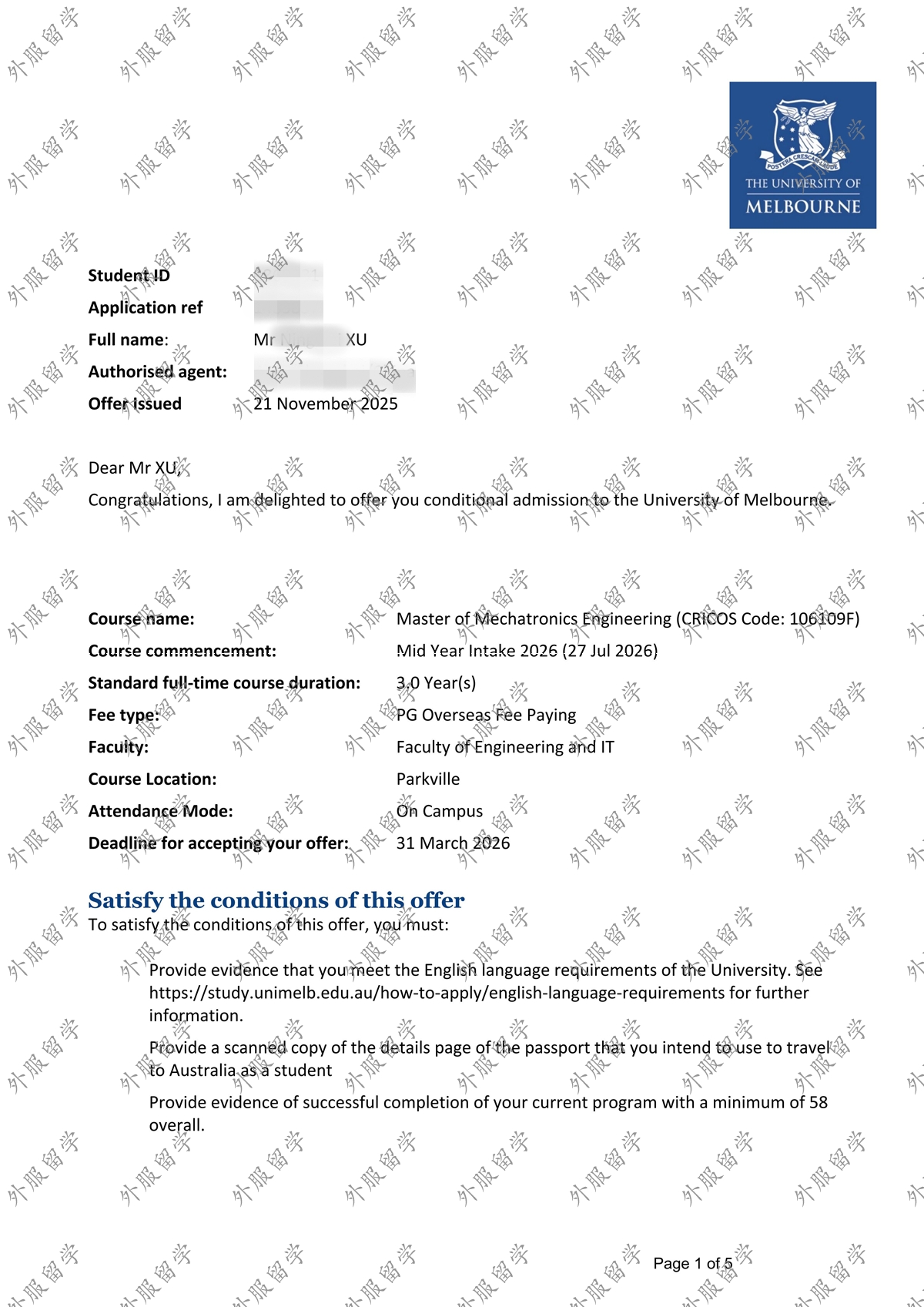 澳大利亚墨尔本大学机电工程专业硕士offer