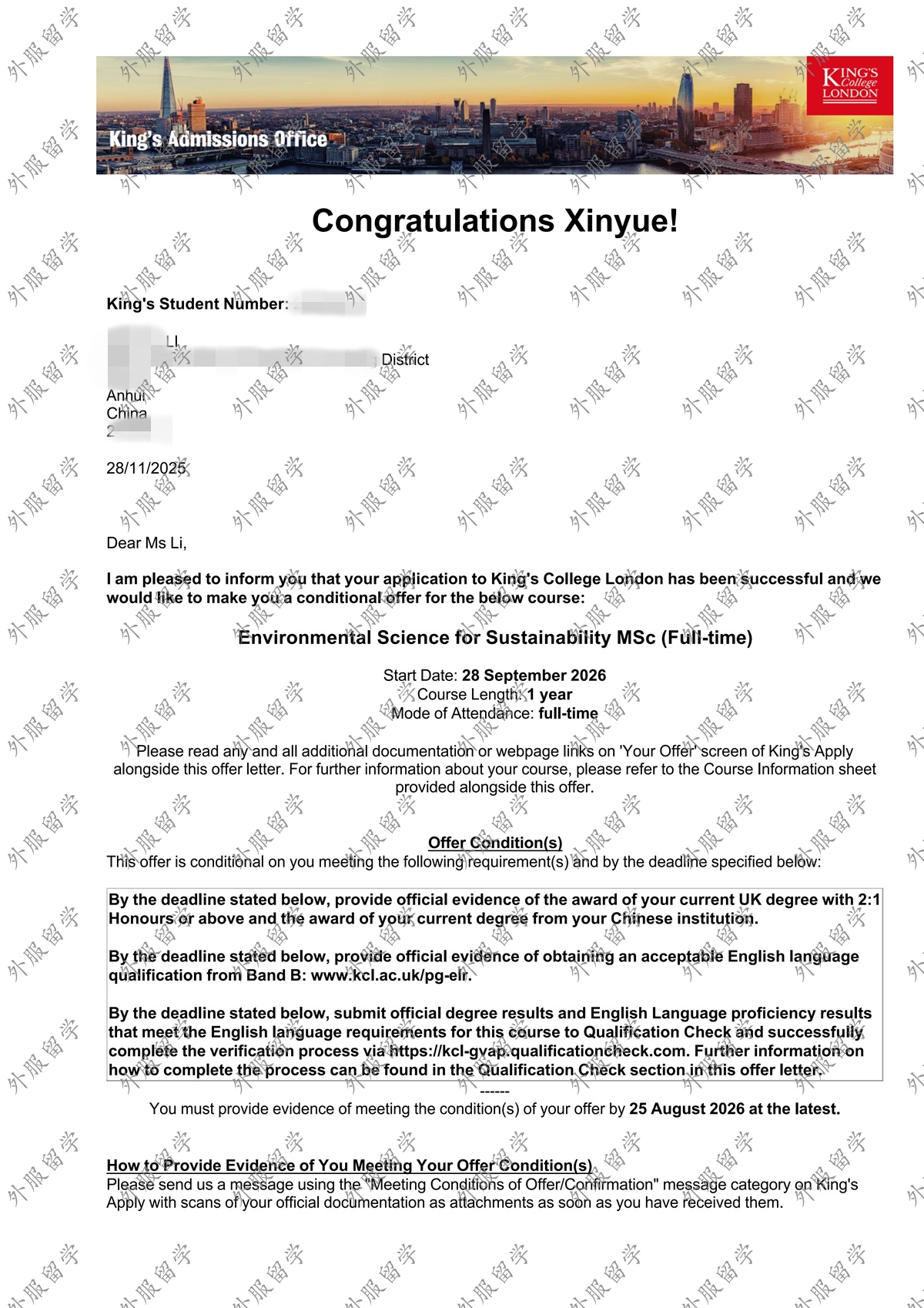 英国伦敦国王学院可持续发展环境科学专业硕士offer