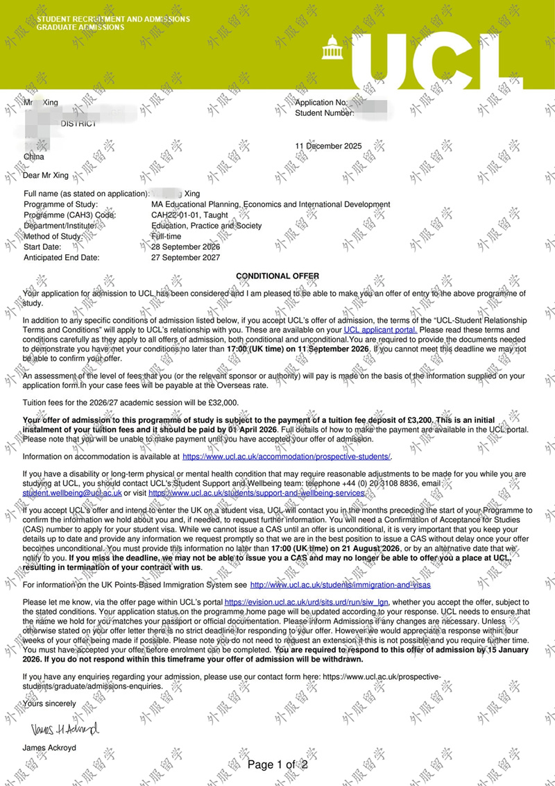 英国伦敦大学学院教育规划,经济学与国际发展专业硕士offer