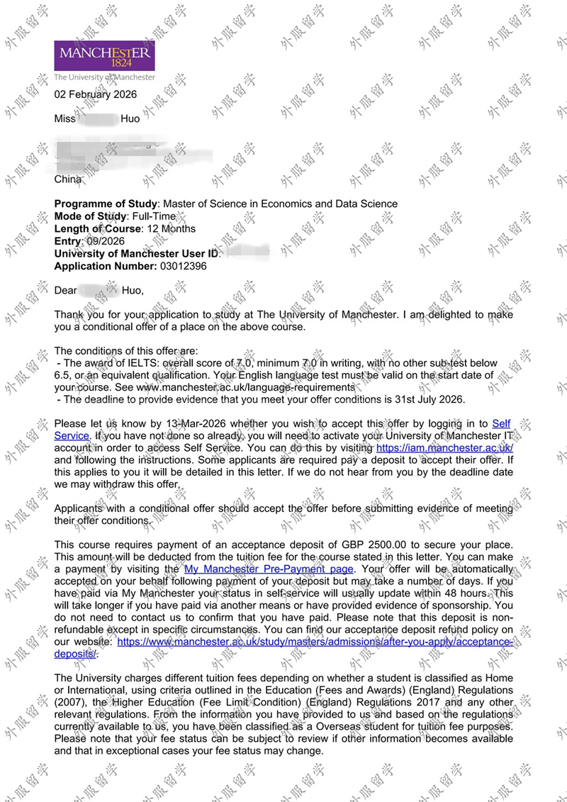 英国曼彻斯特大学经济与数据科学专业硕士offer