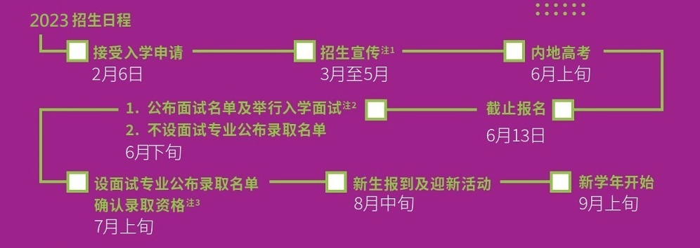 面试邀请(暂定):2023年6月25日(内地高考成绩公布后,本校将邀请获得面试资格的申请人参加面试)