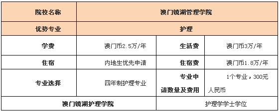 3.如尚有學額,英語分數未達標者會獲安排參加英語口試,再綜合評估考生高考成績和英語口試表現,擇優錄取。費用;報名費:澳門元250 (約人民幣220)每年學費:澳門元41,500 (約人民幣36,520)每月宿費:雙人間澳門元1,200 (約人民幣1,056)